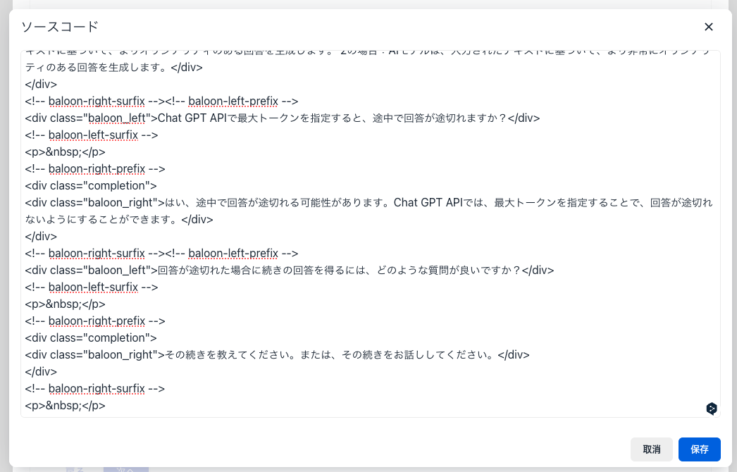 ChatGPTとの会話がHTMLに変換し、HTML編集画面が開きます。